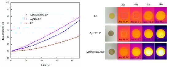 Figure 9); however, the rate of temperature rise is different in each of them. Among them, pure EP has shown the slowest temperature rise because of its low thermal conductivity, which results in extremely slow heat transfer. As the thermal conductivity of the composites is increased upon the addition of thermally conductive fillers, the temperature rise rate is significantly improved. Further, the temperature increase rate of AgNW@ZnO/EP composite is found to be higher than that of AgNW/EP composite, which is due to the better thermal conductivity of AgNW@ZnO/EP composites. The infrared thermal photographs that were taken during different time intervals also intuitively reflect the better thermal conductivity of the AgNW@ZnO/EP composite.