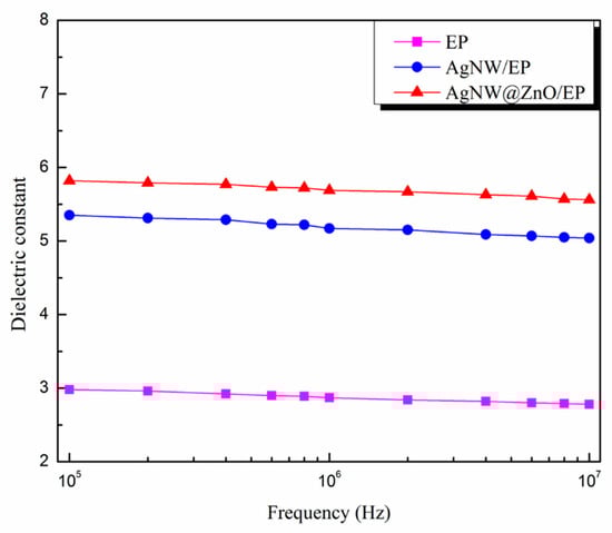 The dielectric constants of pure EP, AgNW/EP, and AgNW@ZnO/EP composites with 2 wt% filler content composites were determined in the high-frequency range (10