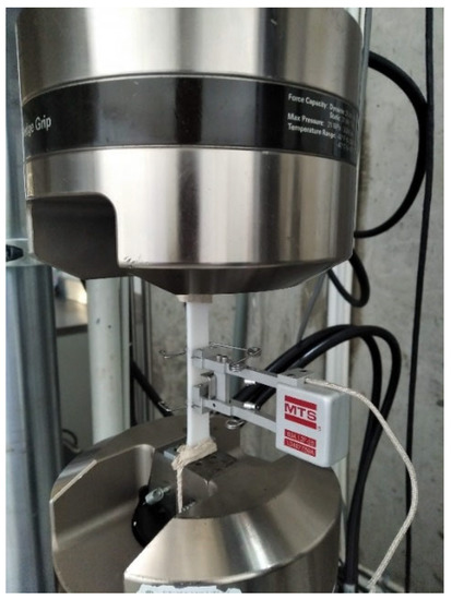 Figure 3), and the extensometer length is calibrated at 25 mm. The chosen gripping method was cloth, as Pyl et al. [