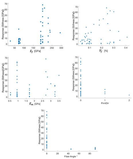 n = 9, namely: {fiber stiffness, fiber angle, fiber strength, fiber Poissons ratio, matrix stiffness, matrix strength, matrix Poissons ratio, print direction, number of fiber layers}. The output is the stiffness or the tensile strength of such AM parts (