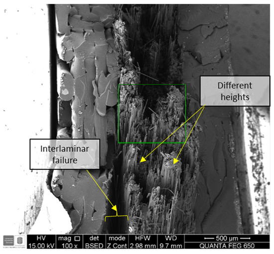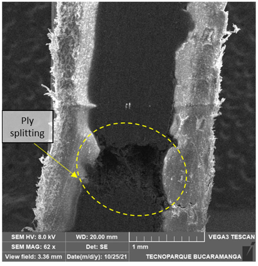 Failure mechanisms, macroscopic damage appearance, and microstructural differences in specimens were observed. In specimens where fibers were aligned to zero degrees, there is a tendency to fail in a translaminar manner. At the same time, the other tested angles exhibited extensive intralaminar damage and plastic drawn out of the matrix.