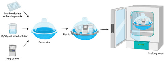 The plates containing collagen gels were placed inside the matryoshka system. The temperature and shaking speed of the incubator were set at 40 °C and 30 rpm, respectively. The system remained closed, and T and RH were registered daily. Around day 10–13, the volume of the collagen gels decreased, and membranes were formed. The matryoshka system was then opened and the membranes were rinsed with bi distilled water until the elimination of the phenol red in the medium. The samples were placed back inside the system to complete a period of 37 days of incubation.