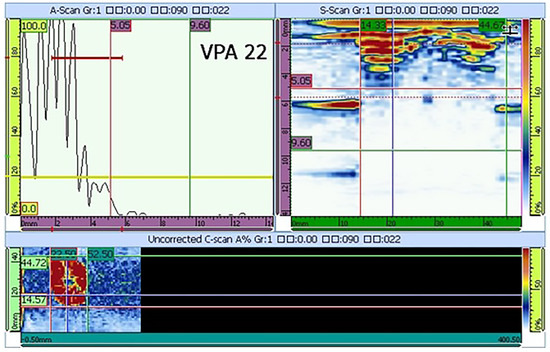 A 1500 mm × 1000 mm × 5 mm carbon fiber/bismaleimide (BMI) laminate ([0/45/90/ − 45]) was made of ZA50GC-12K/KDC101 prepreg (AVIC Composite Materials Ltd., Beijing, China) through an autoclave (GB150, The Sixth Research Institute of China Aerospace Science and Industry Corporation, Hohhot, China), and the curing process is shown in Figure 1. The specimens were cut into 150 mm × 100 mm for a further compression after impact (CAI) test through a mechanical test machine (WDW-500E, Jinan Time Shijin Testing Machine Co., Ltd., Jinan, China) according to ASTM D 7137-17. Prior to the CAI test, the delamination was generated by a quasi-static indentation test, referring to ASTM D6264-17. The indentation test was performed at a speed of 1 mm/min and stopped at a load of 15 kN, then the specimens were ultrasonically scanned from the surface without indentation. The scanning result is shown in Figure 2. The A scan shows the amplitude of ultrasonic return, which can determine the depth of the delamination. The S scan is the vertical section of the delamination area, which can determine the distribution of delamination in the vertical direction. The C scan can obtain the appearance of the delamination of the specimen at a constant depth, a roughly circular delamination with a diameter of about 30 mm in the specimen, as shown in the C scan. The in-plane compressive properties were tested according to the CAI. The strain tested by the gauges on the two sides of the specimen coincided well, showing that the tests were effective (Figure 3). The compressive strength and modulus of the pristine specimen were 328.7 MPa and 50.73 GPa. The compressive strength and modulus of the delaminated specimen were 179.1 MPa and 24.58 GPa, only 54.49% and 48.97% of the pristine specimens, respectively.