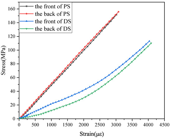 Stress–strain curve of the pristine specimen (PS) and delaminated specimen (DS) under compressive loading (0–3000 ).
