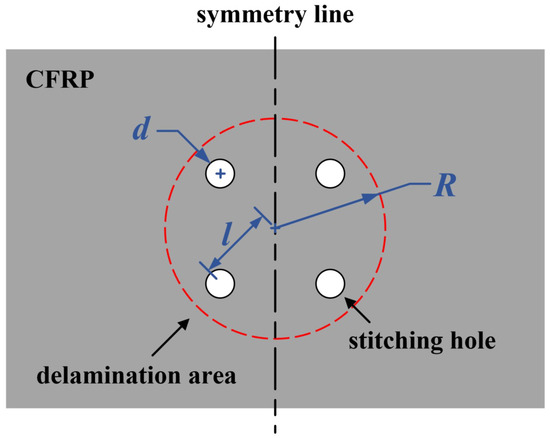 In the stitching repair process, fiber bundles stitching the delamination part play an important role in restraining the relative displacements of neighboring layers. The stitching repair process is as follows. First, the delamination area should be recognized. For such impacts, the delamination area is near a circle. Second, a certain number of holes for stitching were drilled and distributed evenly around the edge of the delamination area. Figure 4 shows a case of the delaminated specimen with four holes. In Figure 4, R is the diameter of the delamination area, d is the diameter of the hole, and l is the distance between the centers of the delamination area and the hole. Third, after cleaning the hole carefully, thread fiber bundles impregnated with glue were put through the holes one by one and were repeated until the holes were fulfilled with the fibers. Finally, the stitched fiber bundles were cured for two hours at a temperature of 120 °C in the oven. After curing, the stitching bundles became pins, producing the bridging effect between delaminated layers. Two kinds of fiber bundles, T700 carbon fibers and Kevlar F-12 fibers, were used for stitching in the experiments. The glue used was J-315, which was an epoxy adhesive purchased from the Institute of Petrochemistry Heilongjiang Academy of Sciences.