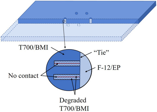 In order to guide the experiment, finite element analysis was used to explore and optimize the parameters of stitching repair through the software ABAQUS. A model of carbon fiber/bismaleimide laminate ([0/45/90/−45], 40 layers in total) with a size of 150 mm × 100 mm × 5 mm was established using C3D8R elements and 30 mm-diameter circular delamination in its 4/5, 12/13 and 20/21 layers. Four independent laminates (4 plies, 8 plies, 8 plies, and 20 plies) were constructed as four parts according to the delamination locations. The four parts were assigned material properties, respectively: the circular delaminated area was assigned the material parameters of degraded ZA50GC/BMI, and the rest of the areas were assigned the material parameters of ZA50GC/BMI. Then, they were assembled by setting the “tie” contact property between the surfaces of the plates one by one, except for the delamination area, to compose the delaminated laminate. Besides this, the degraded mechanical properties were attributed to the part adjacent to the delamination area. The normal and degraded mechanical properties are shown in Table 1, and the degradation principle is in reference to [29]. For stitching repair with Kevlar F-12 fibers, unidirectional Kevlar/epoxy (Kevlar/EP) composite rods as the pins were built. The “tie” contact property was set between the rod surface and the hole surface, as shown in Figure 6. The mechanical properties are detailed in Table 1, where E and G refer to the Young’s modulus and shear modulus, and is the Poisson’s ratio. Subscripts 1, 2, and 3 correspond to the longitudinal and the two transverse directions, respectively. Boundary conditions are in reference to ASTM 7137-17, and the in-plane compressive load applied was 520 kN.