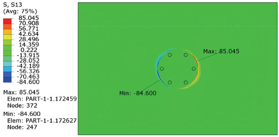 Twelve cases were simulated to discuss the effects of the number, the location, and the size of the stitching holes, as shown in Table 2. In the cases, Case.w/6/2.5 indicates six stitching holes with a diameter of 2.5 mm, and w is the ratio of l/R. As w varies, the positions of the stitching holes change from one case to another. This is to investigate the effect of hole location on the repair of the delaminated laminate. Figure 7 shows the typical stress map of the repaired plate under the in-plane compression of 520 kN. As expected, stress concentrations appear on the crack tip. Table 3 shows the maximum interlaminar shear stress (S) and through-thickness tensile stress (S) in Case.w/6/2.5. When w changed from 0.3 to 0.8, S decreased from 96.34 MPa to 85.04 MPa; however, S increased slightly. When w was 1.0, both S and S increased obviously. Compared with the strength, it is evident that the interlaminar shear stress is much more critical for crack propagation. Therefore, S was used to evaluate the repair effect. The nearer the pins are located to the crack tip, the more influential the restraintof the relative displacements of neighboring layers can be, which was proven by the results of S in Table 3. Therefore, w should be near 1.0. However, when the pins are located at the crack tip, the stress concentrations become severe. Consequently, 0.6 and 0.8 are candidates for w.