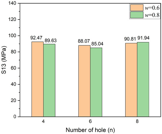 Figure 8 shows the maximum interlaminar shear stress in Case.0.6/n/2.5 and Case.0.8/n/2.5; the cases of six stitching holes, i.e., six pins, exhibited better results. On the one hand, the number of pins should be enough to restrain the relative displacements of neighboring layers effectively; on the other hand, stitching holes can be considered as defects, leading to more severe stress concentrations. Consequently, the laminate with six stitching holes reached a good balance in these cases. Furthermore, compared with Case.0.6/6/2.5, Case.0.8/6/2.5 was much better.
