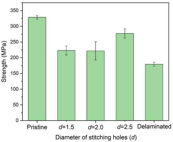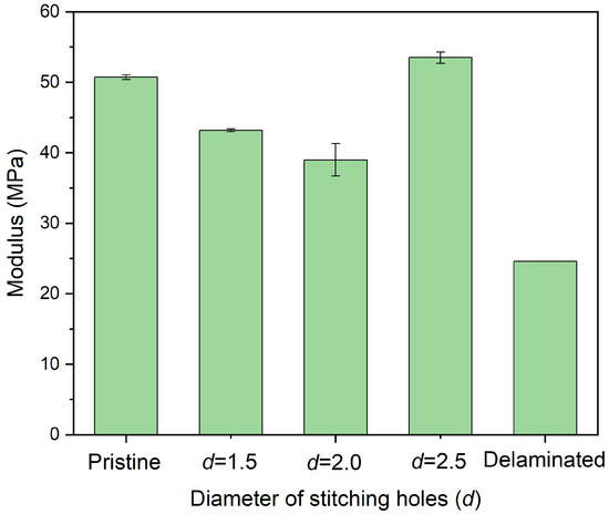 The size effect of stitching holes was studied again through experiments. Figure 10 shows the in-plane compressive strength of delaminated plates after stitching repair with Kevlar F-12 fiber bundles in which six stitching holes and w = 0.8 were adopted, and the diameter of the hole was different. The strength of the repaired plates with 2.5 mm-diameter stitching holes was 276.9 MPa, about 84.23% of the pristine plate. The plates repaired with 1.5 mm- and 2.0 mm-diameter stitching holes showed a similar strength, only 67.83% and 67.41% of the pristine one, respectively. Figure 11 shows the in-plane compressive modulus of the plates. For the case of a 2.5 mm diameter, the modulus was 53.5 GPa, about 105.44% of the pristine plate. This may be caused by the additional fiber bundles attaching to the plates, as shown in Figure 5a. For the 1.5 mm and 2.0 mm cases, the modulus was only 43.2 GPa and 39.0 GPa. Obviously, 2.5 mm-diameter holes are recommended.
