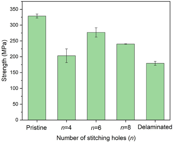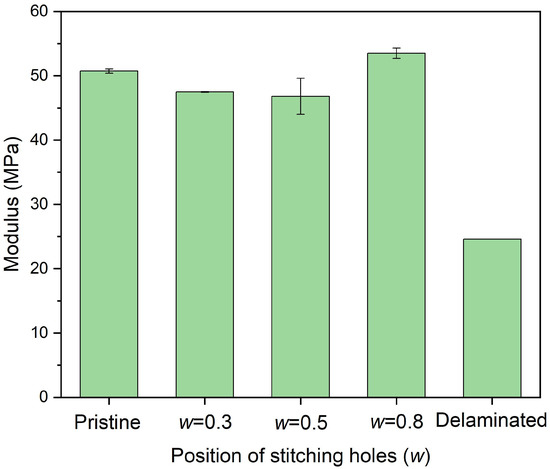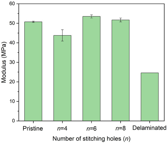 Figure 14 shows the in-plane compressive strength of delaminated plates after stitching repair with a different number of stitching holes, where w = 0.8 and a 2.5 mm diameter were adopted. As the FEM result, using six stitching holes, i.e., six pins, we achieved a better repair effect. Four pins alone cannot support the sufficient strength and stiffness of the repair, and eight stitching holes result in more defects, reducing the repair effect. Figure 15 shows the in-plane compressive modulus of the plates. Though the strength was not good, the modulus of the plate repaired with eight stitching holes was fully recovered. Another detail that should be noted is that the data discreteness of the case n = 4 was much wider. Actually, the tightness of the stitching bundles determines the stiffness and the strength of the cured pins, which are essential for the bridging effect. Because the stitching repair was performed manually, the tightness difference of the bundles in different holes was inevitable. When the number of the pin was small, such as only four pins, the difference resulted in severe structural asymmetry, leading to premature failure and wide discreteness. On the contrary, more pins can weaken the difference, tending to obtain better repair effects.
