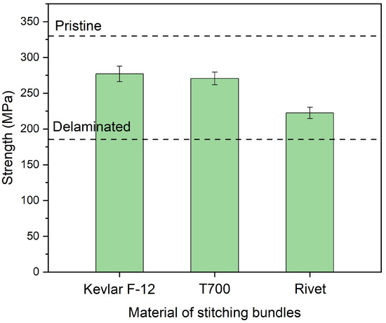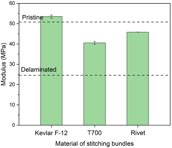 Figure 16 shows the recovered strength of the plates stitched by Kevlar F-12 bundles, T700 fiber bundles, and aluminum rivets with the parameters w = 0.8, d = 2.5, and n = 6. When stitched with T700 fiber bundles, the strength was 270.6 MPa and 82.34% of the pristine plates. The strength was the lowest repaired with aluminum rivets, only 222.5 MPa and 60.9% of the pristine plates. The tensile modulus of Kevlar F-12 fibers and T700 fibers was about 120 GPa and 210 GPa, respectively. The modulus and strength of T700/EP were also higher than Kevlar F-12/EP. Consequently, the repair effect using T700 fiber bundles should have been better than the repair using Kevlar F-12 bundles. Figure 17 shows the in-plane compressive modulus of the plates stitched by Kevlar F-12 bundles, T700 fiber bundles, and aluminum rivets with the parameters w = 0.8, d = 2.5, and n = 6. When stitched with Kevlar F-12 fiber bundles, the modulus was 53.5 GPa, about 105.44% of the pristine plate. The in-plane compressive modulus improvement was higher than the other stitching materials.
