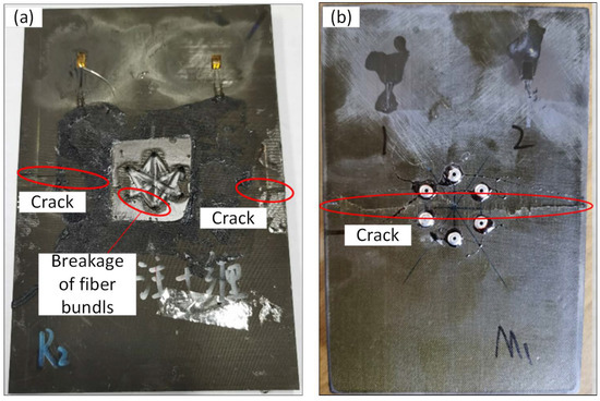 However, the repair effect using the Kevlar F-12 bundle is better; the excellent toughness of Kevlar fibers may cause this. Due to low toughness, the breakage of T700 fibers can be observed in the stitching process, and T700 bundles were broken at the periphery of the stitching holes, as shown in Figure 18a. A similar phenomenon was not observed in the Kevlar repairing plates. Figure 18b shows that until the final fracture, the aluminum rivet had not broken. Consequently, the lousy repair effect of using aluminum rivets can be attributed to the low modulus, only about 70 GPa, and bad bonding strength between the aluminum rivet and the composite surface.