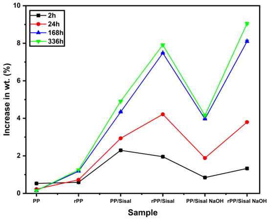 The high liquid absorption is related to the hydrophilic nature of the sisal fiber [54]. The high absorption values of the composites indicate that the fiber absorbed a significant amount of water throughout the test. Pure PP showed the lowest water absorption values, disclosing a weight increase under 1% throughout the test, reinforcing the fact that the fiber absorbed most of the liquid in the composite samples.