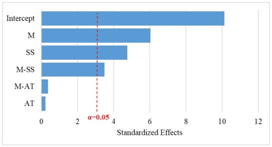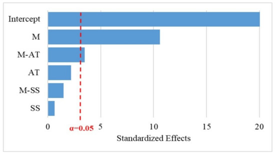 The p-values for the factors (M, AT and SS) and interactions (M-AT, M-SS and AT-SS) shown in Table 4, Table 5 and Table 6 indicate the influence on the response variables (H, I and D). As the level of confidence was considered to be 95%, then if p-value of the factor or the interaction was lower than or equal to the risk degree (0.05 or 5%) there was a significant correlation between the response variables and the factor, while p-values higher than 0.05, indicated the absence of correlation. The results illustrated in Table 4 show that the factor AT and the interaction M-AT had statistical significance on the response variable H, confirming the relevant influence of the alkali treatment on the hardness of the composite. In contrast, the regression results showed that the impact resistance response was not influenced by the AT factor (Table 6). It can also be observed that the addition of the sisal layer to the rPP or PP composites was relevant for the impact resistance, thus recommending its use. The M variable represents the most significant factor in all analyses, a result corroborated in the Pareto diagrams, Figure 5 and Figure 6. The reference line on the graphs indicates which effects are significant. In this study, Lenth’s method [62] was used to draw the reference line. Terms with effects to the right of the line represent significant parameters.