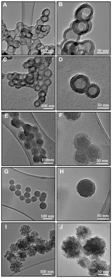 All synthesized samples showed a pseudospherical shape and a size of about 90 nm in diameter. In the micrographs of both SiO2-Hep_1 (Figure 1A,B) and SiO2-Hep_2 (Figure 1C,D) samples, where a lower amount of heparin was used, core-shell structures were clearly visible by the difference in contrast between the outer darker layer about 20 nm thick and the lighter inner core. As the amount of heparin in the starting solution increased, the structure of the NPs evolved into more uniform architectures (Figure 1E–H) where darker inner cores were surrounded by a lighter halo, about 10 nm in thickness. On the other hand, at higher heparin concentration (SiO2-Hep_5 NPs) the core-shell structure was no longer visible, and the resulting structure (Figure 1I,J) appeared quite different from all other systems, showing a ‘cloudy’ structure with no well-defined shape [26].