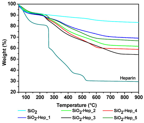 All TGA curves (Figure 2) exhibited a first weight loss at temperatures lower than 150 °C, attributed to the loss of adsorbed water. In the thermogravimetric curve of the silica-gel nanoparticles, a very small weight change of about 3 wt% was observed at higher temperatures, usually associated with the decomposition of residual alkoxides groups and/or dehydroxylation [27]. The TG curve of neat heparin showed a pronounced weight loss in the region between 200–600 °C due to the heparin thermal decomposition and a residual mass of about 30 wt% at 900 °C [23,28].