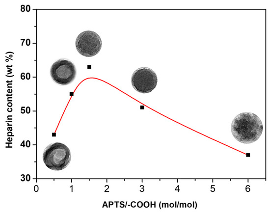 Furthermore, Figure 3 shows heparin weight percent, as determined by TG curves, as a function of APTS/-COOH molar ratio.