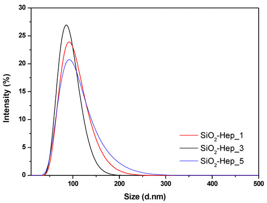 DLS analysis showed a mean hydrodynamic diameter of about 90 nm in the case of the SiO2-Hep_3 sample. Much larger particle sizes, of about 100 nm, were observed for both SiO2-Hep_1 and SiO2-Hep_5 NPs. In addition, in agreement with the TEM investigation, this latter sample exhibited a wide size distribution, probably related to the presence of particles with different diameters.