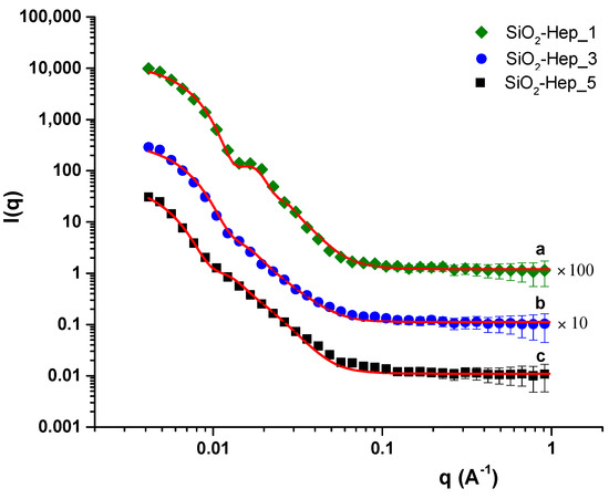 SANS profiles and corresponding best fitting curves of SiO2–Hep_1 (a), SiO2–Hep_3; (b) and SiO2–Hep_5; (c) suspensions in D2O.