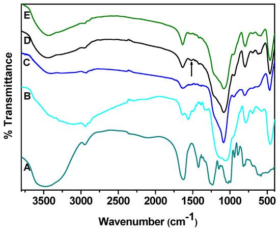 FTIR spectra of both bare heparin (A), silica (B), SiO2−Hep_1 (C), SiO2−Hep_3 (D), and SiO2−Hep_5 (E) hybrid nanoparticles.