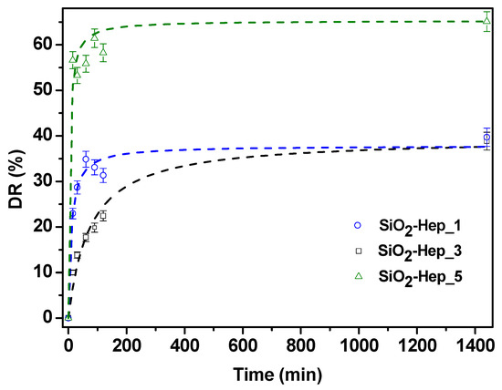 Electrostatic attractions between the positive charge of the dye and the negative charge of heparin together with the hydrophobic interactions cationic dyes are easily adsorbed onto heparin-functionalized systems [42], resulting in the highest absorption efficiency obtained in the SiO2-Hep_3 sample. ζ-Pot measurements evidenced the presence of surface amine groups onto the SiO2-Hep_1 sample. These moieties might be involved in the nucleophilic addition reaction with the isothiocyanate groups of the dye, thus justifying the high adsorption efficiency also detected in this case. On the contrary, in the SiO2-Hep_5 sample, the drug loading amount achieved the lowest values. Despite the largest specific surface area among the investigated samples, the lower heparin content than the SiO2-Hep_3 sample negatively affected the encapsulation efficiency of RBiso.