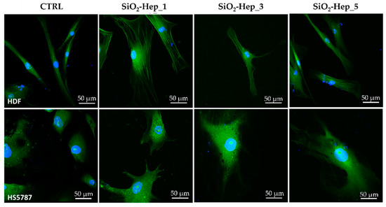 The biocompatibility of the SiO2-Hep_1, SiO2-Hep_3, and SiO2-Hep_5 hybrid NPs was firstly confirmed by cells morphology evaluation. Actin filaments, a constituent of the cytoskeleton, were stained with FTIC phalloidin after 24 h of incubation with the different NP formulations. Both healthy HDF cells and HS578T cancer cells (Figure 8) exhibited a no cytotoxicity morphology characterized by a spread or spindle-shaped appearance and the presence of several extending processes, showing cells protrusion adhering to the flat surface.