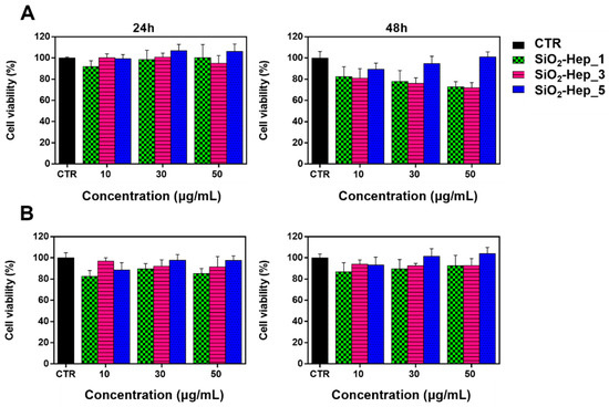 Cell Viability percentage of (A) HDF and (B) HS578T cells lines after 24 and 48 h of incubations with SiO2-Hep_1, SiO2-Hep_3, and SiO2-Hep_5 NPs, at concentration of 10, 30, and 50 µg.