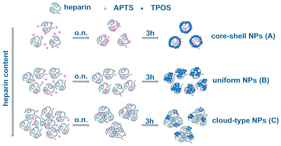 At intermediate heparin content, Scheme 2B, APTS/-COOH molar ratio is almost 1, and only ‘bound’ APTS moieties are expected in the starting solution. In this case, when TPOS was added to a solution containing many heparin-APTS nucleation centers, the increased number of binding sites for hydrolyzed TPOS moieties led to a more homogeneous population of primary particles made of silica nuclei distributed onto heparin chains. In this case, the particles keep growing uniformly in diameter resulting in the final homogeneous size distribution of hybrid particles with heparin both inside and at the surface. More specifically, heparin chains located on the surface of the nanoparticles organize themselves into a thin shell, as revealed by TEM measurements.