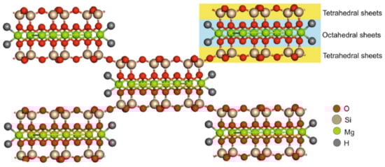 Octahedral magnesium is sandwiched between two tetrahedral sheets of silica. The structural discontinuity of the sheets arises because of the inversion of the Si–O–Si bond, which leads to the formation of tunnels or pores extending along the axis of the fibers [33]. The structure of sepiolite is shown in Figure 1. The silanol group (Si–OH) present at the edges or corners has affinity for the inorganic ions and polymer matrix composites.