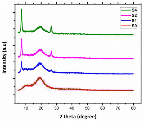 The X-ray diffraction pattern of pristine polystyrene S0 and the effect of adding m-sepiolite as a filler on % crystallinity of polystyrene-sepiolite nanocomposite S1, S2 and S4 formulations are presented in Figure 4. A broad diffraction peak at 20.0° with d = 0.22 observed in S0 shows the amorphous nature of polystyrene [47,48]. The percent crystallinity obtained computationally using the XRD deconvolution method in Eq.1 shows an increase from 35.9% in the S1 sample to 47.3% in the S4 sample because of m-sepiolite clay being added into the polystyrene matrix. This also results in a decrease in broadness of 2θ (X-axis) values at 7.25°, 20.0° and 27.5°, as shown in the XRD pattern. The intense peak at 7.27° with interatomic distance d = 1.22 nm with (110) shows the covalent interaction and exfoliation of clay nanoparticles in the polystyrene matrix and becomes sharper with the increase in the concentration (wt.%) of m-sepiolite. Therefore, the addition of a filler causes an increase in the intra-atomic distance or d-spacing due to the expansion in the polymer matrix, which is attributed to more favorable interactions between the polymer matrix and the filler [49]. The mechanical properties are also related to the level of saturation and dispersion of clay nanoparticles in the polymer matrix. Further, a sharp peak observed at 27.5° (d-spacing = 0.16 nm) evidences the increase in percent crystallinity upon increasing the filler content of m-sepiolite in the polystyrene matrix. These results enhanced the mechanical and thermal properties of nanocomposites, as is also evident in the tensile testing, TGA and DSC results.