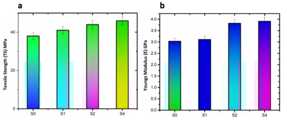 The mechanical properties of pristine PS and PS/m-sepiolite nanocomposites showing the yield strength (YS), tensile strength (TS), Young’s modulus (E) and elongation at break (Eb) are summarized in Table 3. The comparison among the tensile strengths of pristine PS and fabricated nanocomposites is shown in Figure 6a. The graphs indicate an increasing trend in tensile strengths of the nanocomposite. The tensile strength of pristine PS was 38.74 MPa, which increased to 46.29 MPa by adding 4 wt.% of modified sepiolite clay, indicating a better compatibility between the matrix and the filler at the interface. This can be attributed to siloxane (Si–O–C) linkages, as evident from the FTIR spectra. Similarly, the Young’s modulus (E) results of pristine PS and the nanocomposites were compared in Figure 6b, indicating the highest value with 4 wt.% loading of m-sepiolite. This increase in the mechanical properties of the nanocomposites indicates robust intermolecular interaction and better dispersion, as evident from the SEM analyses. In contrast to TS and E, Eb decreased from 2.16 to 1.61% upon addition of the m-sepiolite clay in the nanocomposites as compared to pristine PS. The decrease in Eb depicts a transition of amorphous PS toward a semicrystalline structure of the polymer nanocomposites with the addition of the filler. It was observed that the increase in filler content in the polymer matrix might have led to a rigid interphase, thereby reducing the deformability.