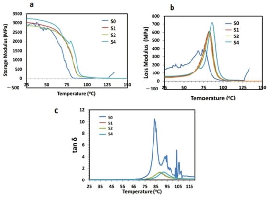 The loss modulus (E″) is the amount of energy loss upon heating in response to the viscoelastic behavior of the material [54]. Figure 7b indicates the variation in the E″ of pristine PS and nanocomposites with temperature in the range of 25 to 150 °C at a constant frequency of 1 Hz. Initially, at low temperature, the E″ of pristine PS (S0) was high; however, it decreased with the loading of the filler from 1 wt.% to 4 wt.% in S1, S2 and S4 due to better interfacial adhesion at the matrix–filler interphase, which is attributed to the semi-crystalline nature inducing greater stiffness and hardness. However, as the temperature increased up to Tg of PS, the value of E″ in the nanocomposites greatly increased as compared to pristine PS because of internal molecular frictions at the matrix–filler interphase, which caused a hindrance in material flow, dissipating more energy in terms of force [55]. It was further observed that the E″ decreased exponentially in the glass transition phase by observing a sharp peak as the material turned viscous in the rubbery region.