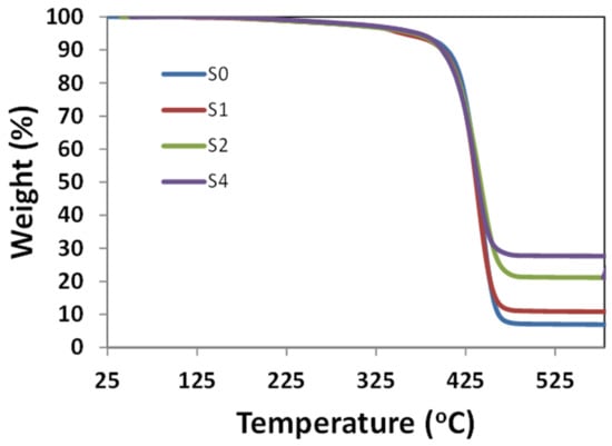 Thermogravimetric analyses of the pristine PS and PS/sepiolite nanocomposites are shown in Figure 8. Degradation for all the samples was observed at 450 °C, as indicated by weight loss. The amounts of residue increased from 5.8 wt.% to 30.2 wt.% by incorporating m-sepiolite in S1, S2 and S4 samples, indicating an increase in thermal stability. Thus, the loading of m-sepiolite clay in the polymer matrix significantly increased the thermal stability due to a better cross-linked structure between the matrix–filler interphase, which exhibited better mechanical properties and resulted in an enhanced thermal stability.