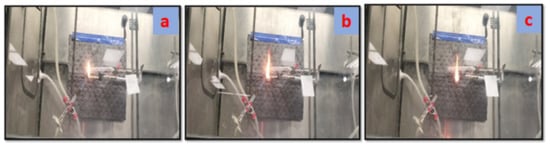 (a) Lighting of composite sample, (b) Distance of 25 mm traveled by the flame in T1, (c) Distance of 60 mm traveled by the flame in T2.