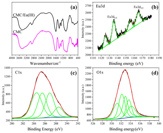 FTIR and XPS spectra of CMC/Eu (Ⅲ) composite. (a) FTIR spectra; (b–d) XPS spectra.