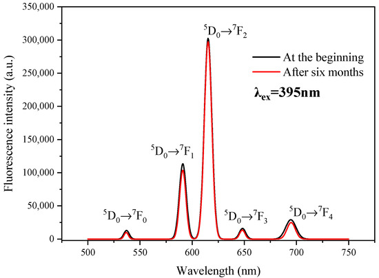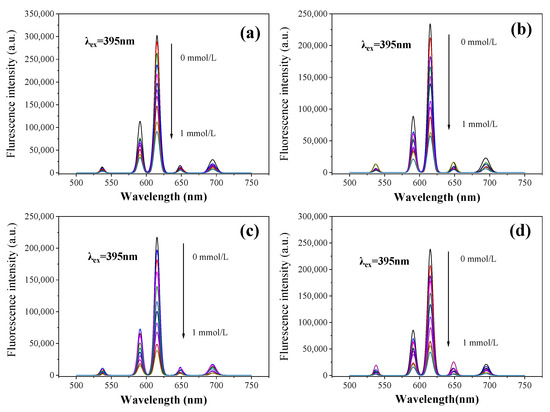 Next, 0.6 mL of acrylamide aqueous solutions were added to 2.4 mL of CMC/Eu (Ⅲ) suspensions (5%), respectively. These mixed solutions were kept for 3 min, and then, the fluorescence intensity (λem = 615 nm) was detected at room temperature (λex = 395 nm). The changes in the fluorescence intensities of the solution in the range of 500 nm–750 nm were recorded.