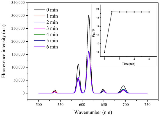 The result of Figure 4 demonstrates that the CMC/Eu (Ⅲ) fluorescent probe can significantly and rapidly respond to acrylamide. In our later study, we used 3 min as the detection time to ensure complete reaction and stable peak intensity value.