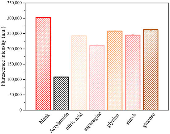 To investigate the selectivity of CMC/Eu (Ⅲ) fluorescent probes to acrylamide, some other substances and ions involved in food and food processing were used to evaluate the interference during the acrylamide detection. The concentration of all these interferents was set at 0.1 mmol/L. Starch and glucose are abundant ingredients in many foods, while citric acid is a common additive in beverage and flavor cakes. Glycine is widely used in foods as a flavoring agent because of its mild sweetness. Asparagine could react by reducing sugars, or other sources of carbonyl produces acrylamide in food when heated to sufficient temperature. Therefore, the substances including asparagine, glycine, glucose, citric acid, and starch were used as interferents. The effects of these substances on the fluorescence intensity of the CMC/Eu (Ⅲ) fluorescent probe are shown in Figure 5. Compared with other substances, only acrylamide was able to significantly reduce the fluorescence intensity of the fluorescent probe.