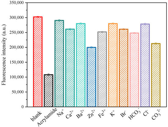 The common ions in food, such as Fe3+, Ca2+, Ba2+, Zn2+, Na+, K+, Cl−, Br−, HCO3−, and CO32−, were also investigated to evaluate their interference on fluorescent probe. As shown in Figure 6, compared to the ionic interfering substances, acrylamide significantly reduced 64.2% of the fluorescence intensity of the CMC/Eu (Ⅲ) fluorescent probe at 615 nm, while other ions showed a limited effect on the fluorescence intensity a reduction of 3.9–33.9%. For example, Zn2+ ion reduced the fluorescence intensity of the probe by 33.9%, but addition concentration of Zn2+ ions was 13.08 mg/L here, which was much higher than the legal addition concentration of it according to the GB 2760-2014 rules, i.e., 2.4 mg/L, for the use of food additives [31]. These experiments suggested that the CMC/Eu (Ⅲ) fluorescent probe has high selectivity to acrylamide detection.