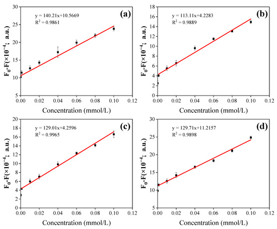 The linear relationship between the fluorescence intensity of CMC/Eu (Ⅲ) at 615 nm and acrylamide concentration in (a) waterborne food simulants, (b) acidic food simulants, (c) alcoholic beverage simulants, and (d) greasy food simulants (0.1 μM–100 μM).