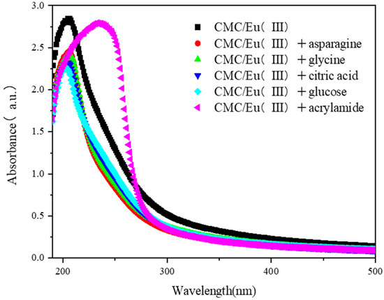 The effect of acrylamide on ultraviolet spectrum of the fluorescent probe is shown in Figure 10. The CMC/Eu (Ⅲ) fluorescent probe has an absorption peak at 205 nm. Adding asparagine, glycine, glucose, and citric acid did not change the absorption spectrum of the fluorescent probe, indicating no interaction between these substances and CMC/Eu (Ⅲ). However, when acrylamide was added to the fluorescent probe, a broader absorption peak shifted significantly from the 205 nm to 234 nm, indicating that acrylamide and CMC/Eu (Ⅲ) formed a new non-fluorescent substance in the static state. Such non-fluorescent substance attributed to the static fluorescence quenching [41]. The presence of a C=O dipole, to a lesser extent than N-C dipole, allows acrylamide to act as H-bond acceptors. The presence of N-H dipoles allows acrylamide to function as H-bond donors as well. Consequently, the O atom in acrylamide could accept H-bonds from water and CMC chains, and the H atoms in N-H could donate H-bonds. Moreover, the O, C, and N atoms in acrylamide have molecular orbitals occupied by delocalized electrons, forming a planar conjugated structure, and the negative charge on the oxygen in an alternative structure by a resonance could function by electrostatic interaction with Eu3+ to enhance the conjugation system in CMC/Eu (III). As a result of the non-fluorescent substance developing by electrostatic interaction and H-bonds between the probe and acrylamide, the UV absorption of the probe after adding acrylamide shifts to a long wavelength. Meanwhile, asparagine, an amino acid containing an amide group, could also form H-bonds with CMC to reduce the fluorescent intensity of the probe a little (see Figure 5). However, the interactions between asparagine and Eu3+ could be largely prevented owing to its pyramidal bigger volume of asparagine, which hardly moves into the curve chains of CMC (see Scheme 1).