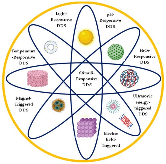 Over the past years, stimuli-responsive delivery systems have gained more attention as they show promising prospects for the delivery of drugs in a controlled manner. Stimuli-responsive drug release means that drug release can be achieved in response to a patient’s physiological condition, including temperature, light, and pH. Different stimuli-responsive delivery systems and nanomaterials are currently being explored for application in ocular drug delivery as depicted in Figure 1 [15].