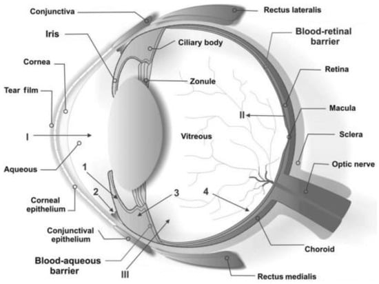 The eye is anatomically and physiologically a very specialized organ with an ultimate function of focusing and processing of light through a nerve network for onward interpretation by the brain [16]. The anatomy and protective mechanisms of the eye, depicted in Figure 2, presents a two-fold challenge for drug delivery.