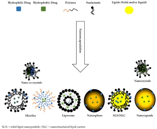 When used as excipients, lipids can accommodate lipophilic drugs where other drug carriers fall short. They can improve water solubility of different drugs, making them ideal excipients for use as drug delivery vehicles. Two main types of lipid-based nanoparticles are SLNs and NLCs [47]. Following their first patenting in 1996, SLNs have since been widely used by scientists due to their stability, non-toxicity, and reliability in their role as vehicles for drug delivery [48]. SLNs exhibit a spherical shape with a diameter size range of 50 to 1000 nm and are mainly composed of lipids that remain solid at room temperature, emulsifiers, a therapeutic agent/drug, and enough of a solvent system. SLNs have revolutionized the research field on DDS as they combine characteristics from different colloidal carriers such as polymeric nanoparticles, liposomes, and microemulsions [49]. Hence, the development of SLNs aimed to overcome shortfalls seen with using the aforementioned colloidal carriers as they demonstrate improved physical stability, targeted drug delivery and good drug release profiles. Further modifications to SLNs to improve drug loading capacity and stability resulted in the development of NLCs [47]. NLCs have considerable benefits over SNLs, hence they hold a more distinguished potential for application in pharmaceuticals [50].