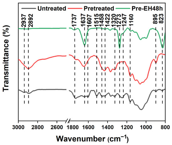 As shown in the XPS results (Table S1), the O/C ratio of the residual from the pretreated bagasse enzymolysis at 20 FPU/g for 48 h decreased from 0.62 to 0.31. In addition, the content of C1 increased (from 31.75% to 58.79%), and the content of C2 decreased (from 53.49% to 27.17%) (Figure S1). As seen from the FTIR results (Figure 1), the characteristic absorption peaks [56,57] at 895 cm−1 (the glycosidic bond of cellulose), 2892 cm−1 (C–H tensile vibration of methyl and methylene), 1160 cm−1 (C–O–C asymmetric stretching of cellulose), and 1066 cm−1 (C–O, C–C stretching vibration) of cellulose were weakened. The characteristic absorption peaks [58,59] at 823 cm−1 (C–H bending vibration of guaiacyl), 1273 cm−1 (C-O stretching vibration of guaiacyl), and 1637 cm−1 (C=O conjugated stretching) of lignin were significantly enhanced in the FTIR of the residue (Figure 1). This is attributed to the cellulose being converted to glucose (98.6%) by cellulase and being removed, while the lignin was retained in the enzymolysis residue.