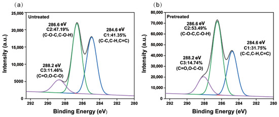As shown in the XPS results (Figure 2a,b), the oxygen-to-carbon (O/C) ratio of untreated bagasse was 0.39. The known theoretical O/C ratios of cellulose, hemicellulose, and lignin are 0.83, 0.81, and 0.33, respectively. The low O/C ratio of natural bagasse can explain the lignin on the surface of the fibrils. The O/C ratio of pretreated bagasse increased to 0.62. The concentrations of C1 (C=C/C-C/C-H), C2 (C-O-C/C-O-H), and C3 (C=O/O-C-O) in untreated bagasse were 41.35%, 47.19%, and 11.46%, respectively. Contributions of cellulose, hemicellulose, and lignin to these peaks have been reported [44,45], with 85% of cellulose signaling to C2 and part of it to C3, 80% of hemicellulose signaling to C2 and the rest to C3, and 50% of lignin signaling to C1 and the rest to C2. The C1 content of pretreated bagasse decreased, while C2 and C3 contents increased. These phenomena suggest that the lignin is removed and the polysaccharides are exposed on the surface of the fibers [46]. This was consistent with the results of the chemical composition and FTIR analysis.