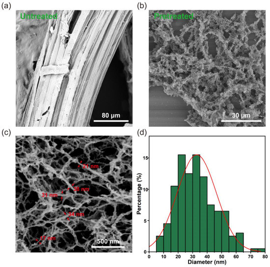 Scanning electron microscopy (SEM) images of (a) untreated bagasse and (b,c) pretreated bagasse; (d) diameter distribution of the nanofibers measured based on SEM images.