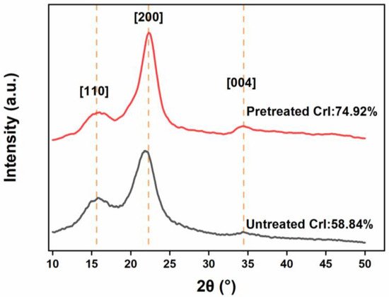 To evaluate the effect of pretreatment on cellulose aggregation, the XRD patterns of untreated and pretreated bagasse were compared (Figure 4). The peaks [48] at 16° (101), 22° (200), and 34° (004) for cellulose I were significantly strengthened in the XRD patterns of untreated and pretreated bagasse. Similarly, the CrI value of the pretreated bagasse increased from 58.84% to 74.92% (Figure 4). There were no obvious clear peaks at 2θ = 12.1° (110 for cellulose II), and 20.2° (110 for cellulose II) in the XRD patterns of pretreated bagasse as reported in the literature [49]. These indicate that the cellulose crystal structure was unchanged, and the supramolecular structure of cellulose was not visibly broken. This implies that the swelling of H3PO4 in cellulose mainly occurs in the intercrystalline spaces rather than the intracrystalline spaces.