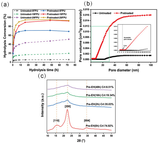 (a) Enzymolysis conversion of untreated and pretreated bagasse at 5, 10, and 20 FPU/g; (b) cumulative pore volume of untreated and pretreated bagasse; (c) X-ray diffraction (XRD) patterns of the pretreated bagasse enzymolysis for 0, 2, 16, and 48 h.