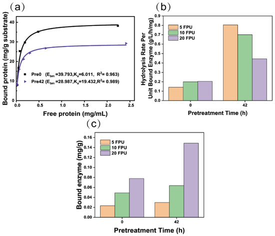 The linear correlation coefficient (R2) was greater than 0.963, indicating that the Langmuir [39,60] equation fits the adsorption isotherm data well (Figure 6a). The affinity constant of pretreated bagasse was 19 L/g, which was three times that of untreated bagasse (6 L/g). This suggests that pretreated bagasse adsorption enzymes require a higher enzyme concentration at saturation than untreated bagasse. The adsorption capacity of cellulase onto the pretreated bagasse decreased to ~29 mg/g from ~40 mg/g (Figure 6a). The adsorption behavior of cellulase onto lignin is well-understood [61] and the hydrophobic lignin enhances the hydrophobic interaction, increasing the adsorption of enzymes onto lignin [62]. The hydrophobic interaction was weakened in pretreated bagasse due to the lower lignin content (Table 1). Cellulase was negatively charged in the buffer at pH 4.8 and demonstrated an electrostatic repulsion of cellulose, which had a negatively charged surface (−45.61 mV). Due to the weakening of the hydrophobic interaction and the enhancement of the electrostatic interaction of pretreated cellulose and cellulase, the adsorption capacity of cellulase onto cellulose decreased, although the SSA of the pretreated bagasse increased (Table 2).